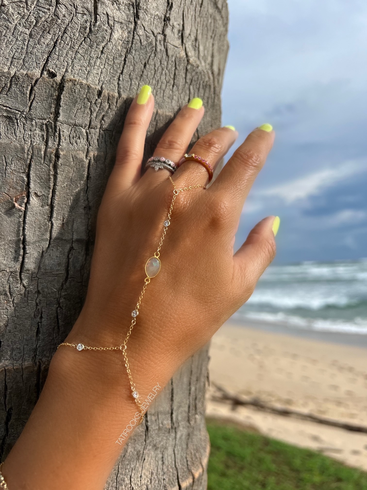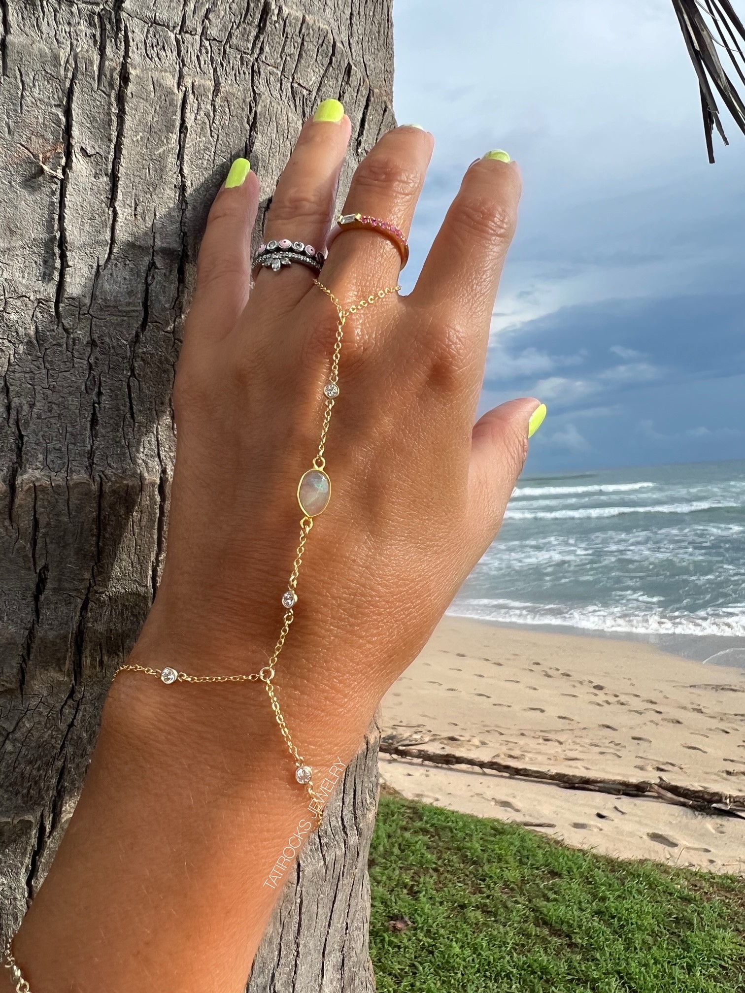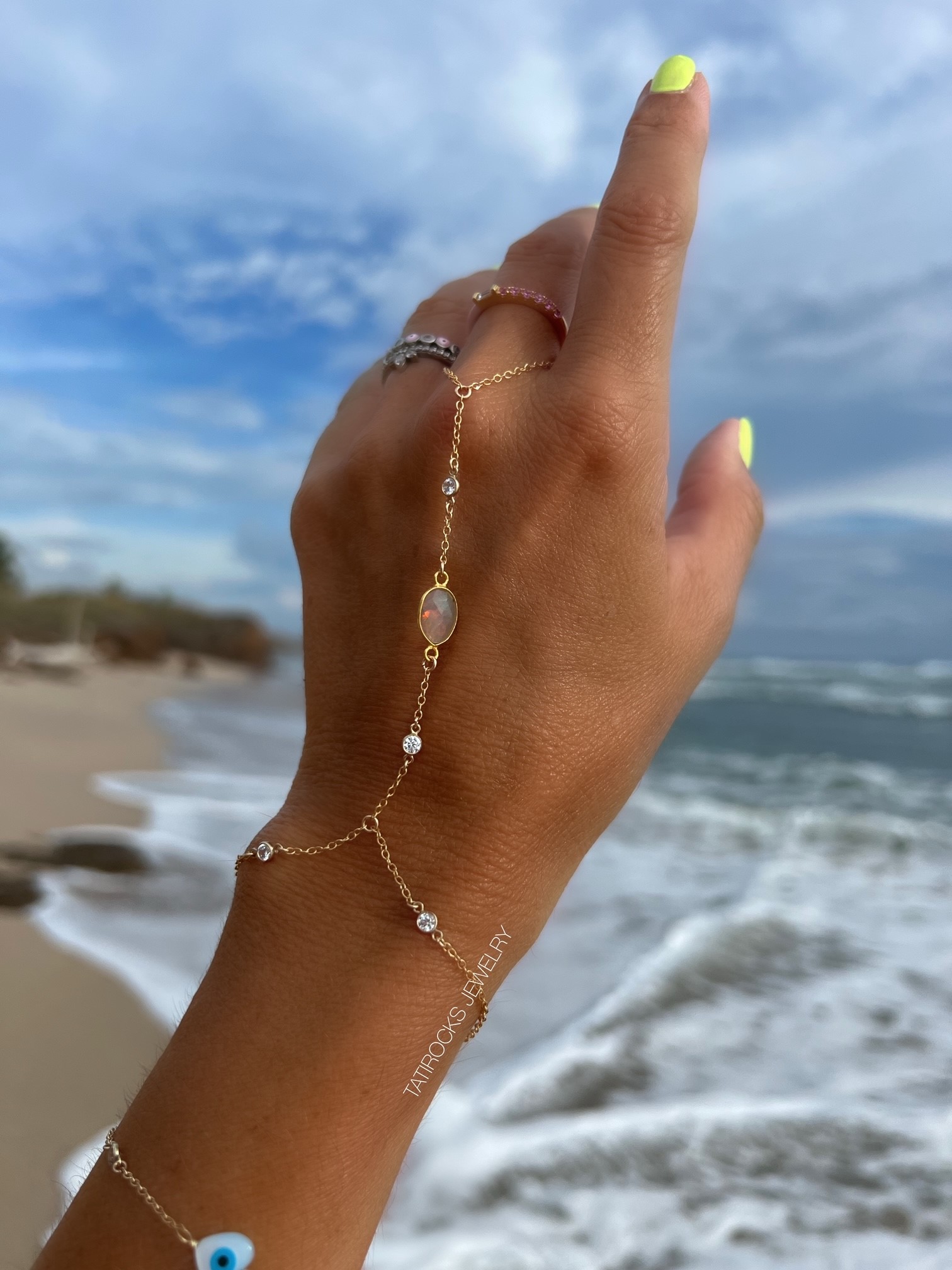 Iridescent hand chain with a fiery genuine Ethiopian Opal oval stone center surrounded by flashy Cubic Zirconia.