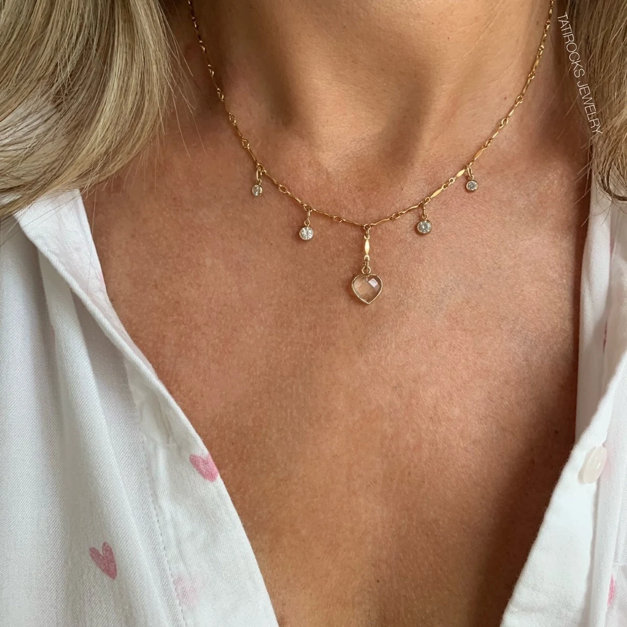 Stunning genuine Crystal Quartz Heart lariat necklace with small Cubic Zirconia dangles.