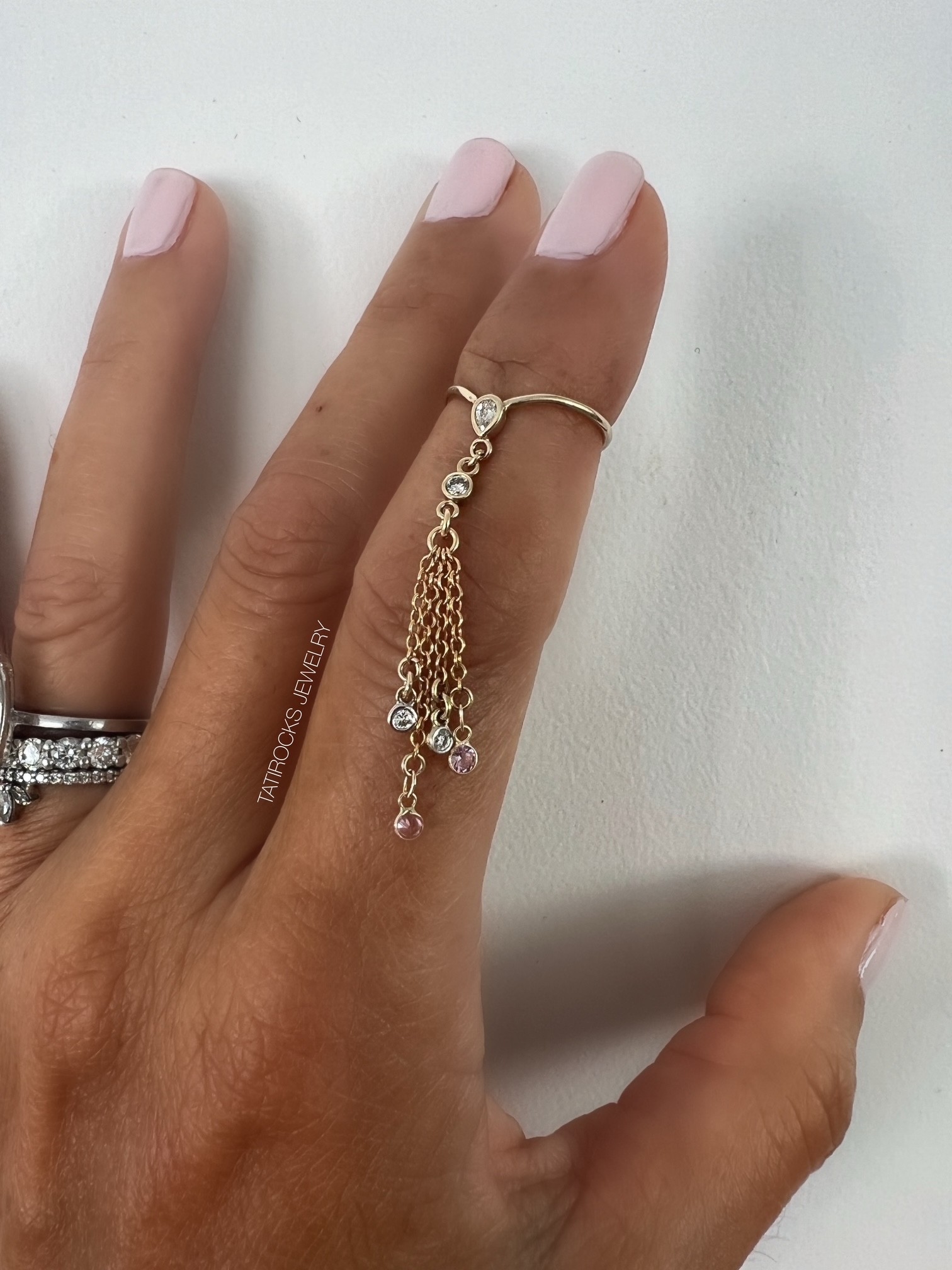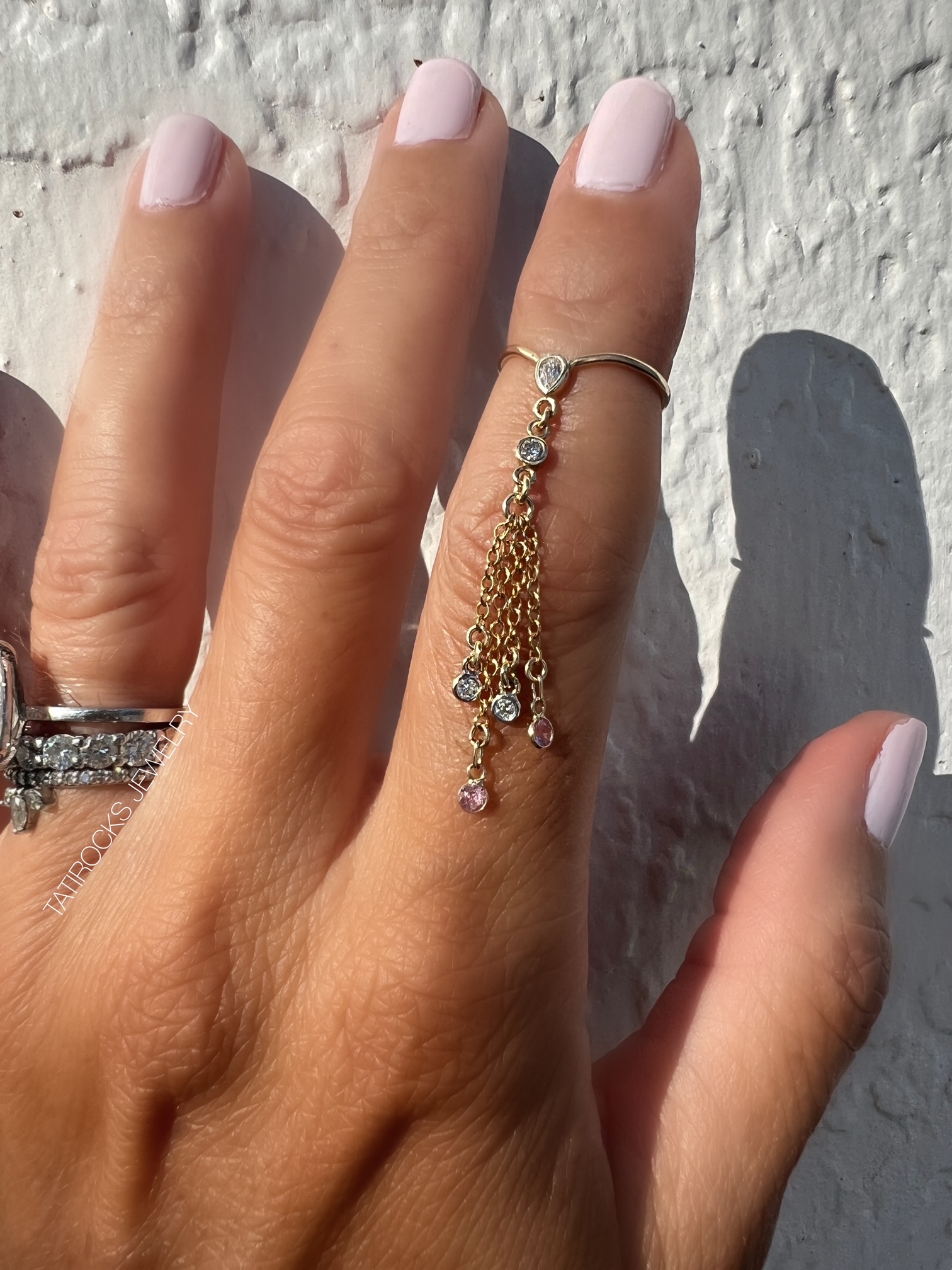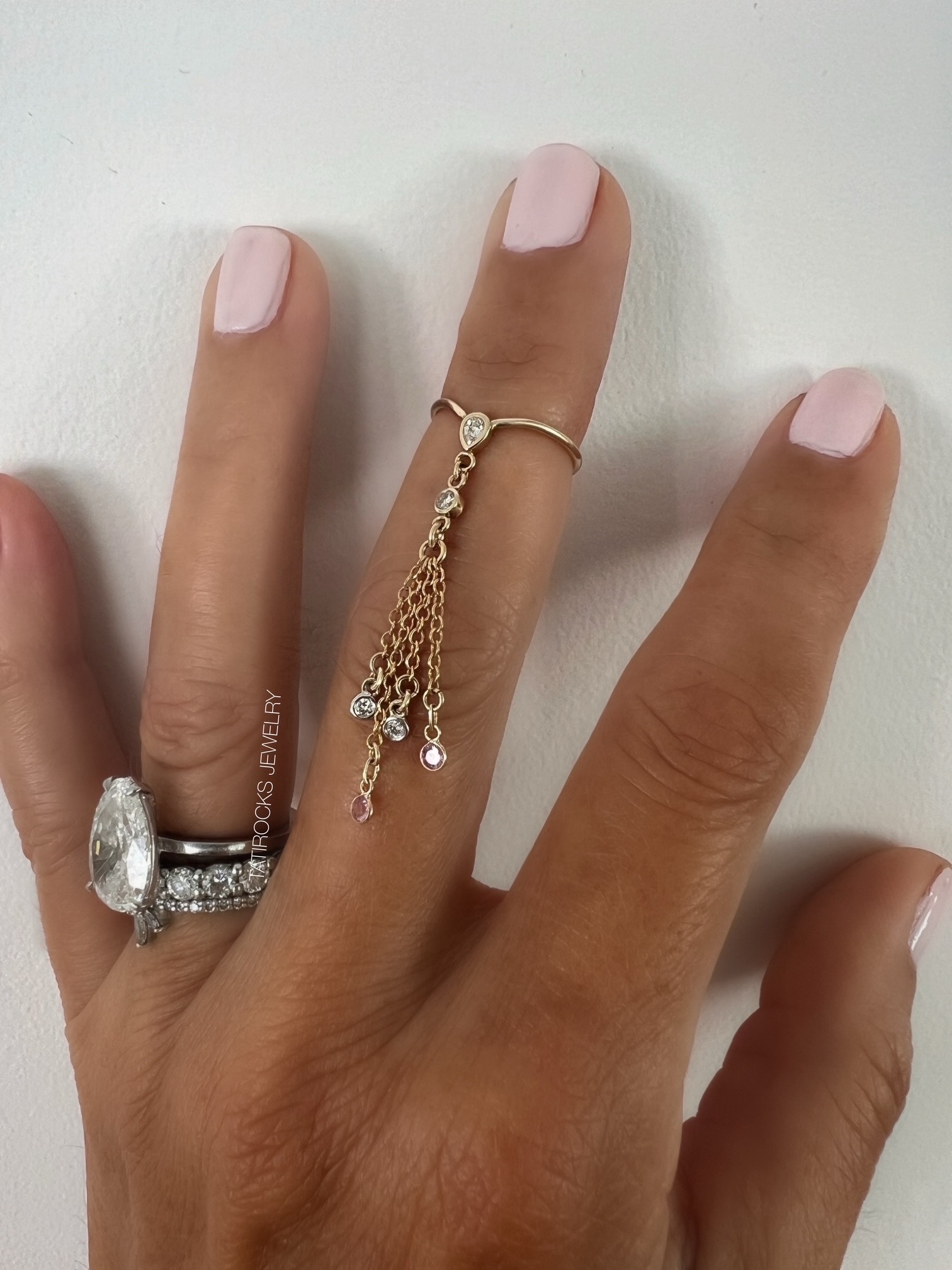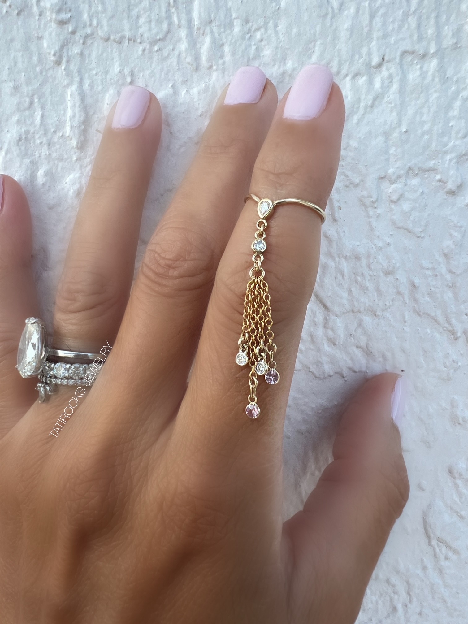 Edgy diamond shaker-style V-ring with diamond and Pink Sapphire dangles.