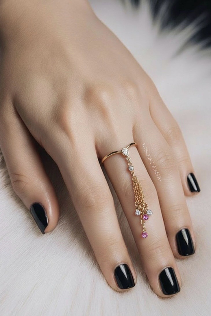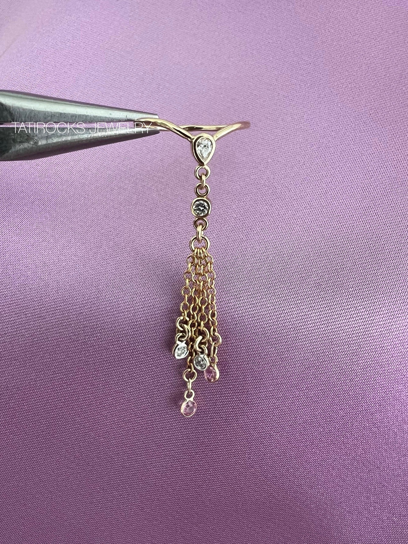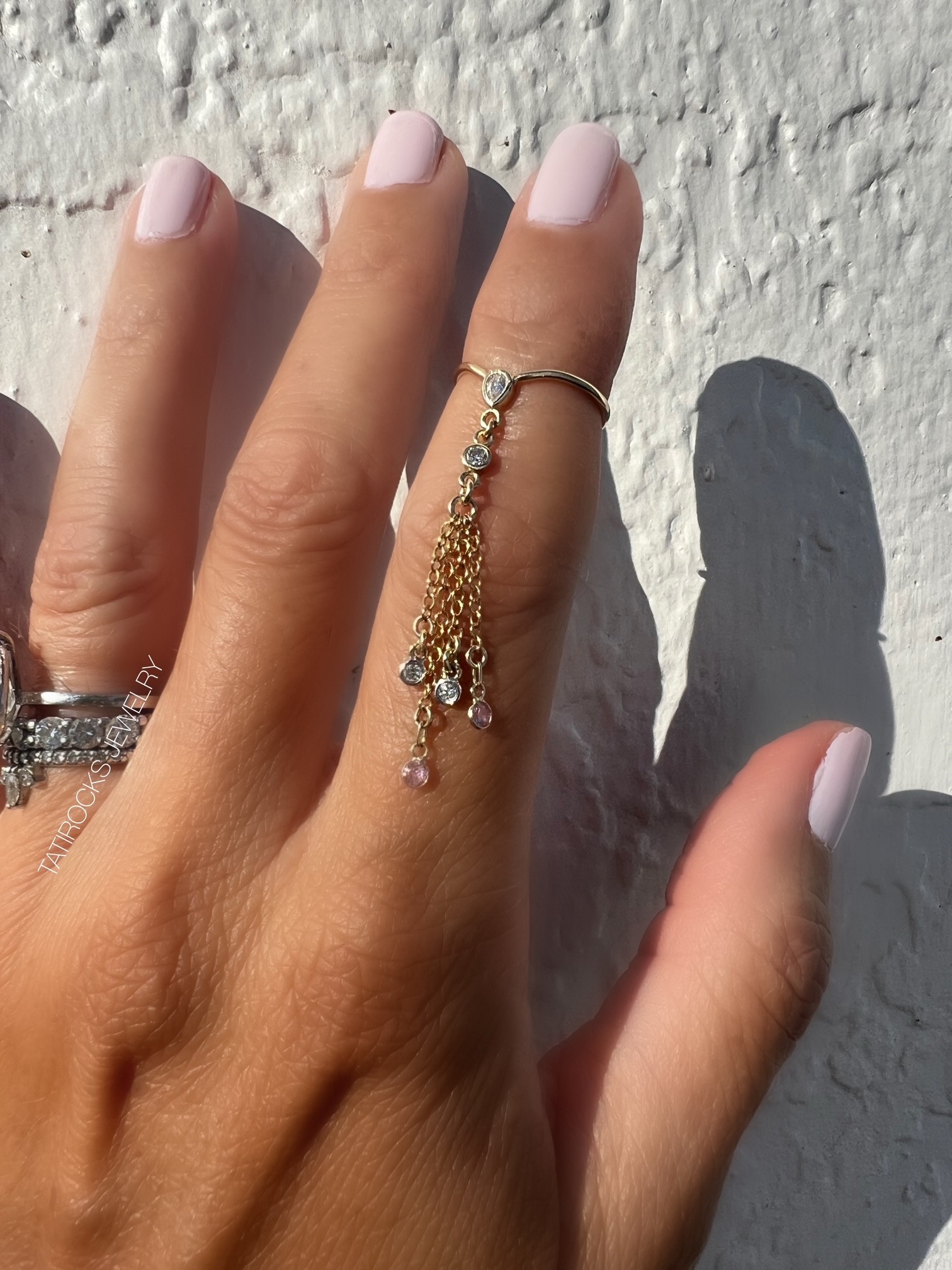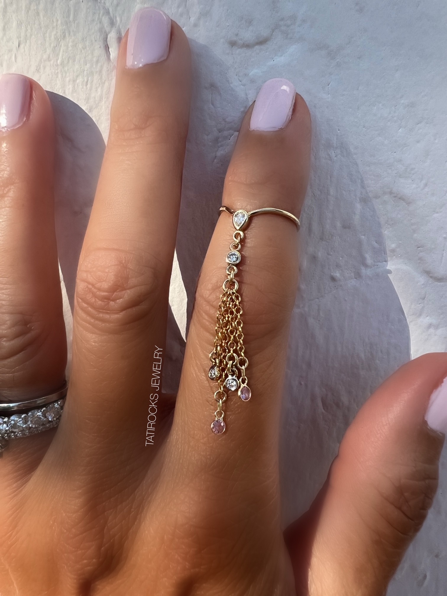 Edgy diamond shaker-style V-ring with diamond and Pink Sapphire dangles.