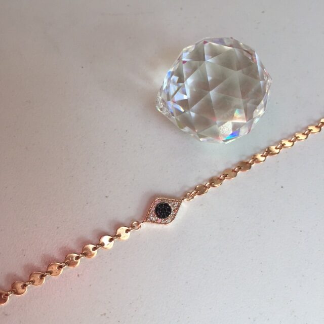 Gorgeous and trendy disc choker with a small Evil Eye in the center. It’s perfect for layering or for a minimal look.